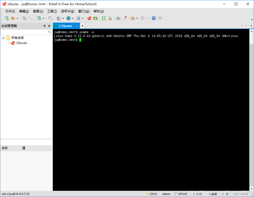 2. SSH连接工具,用来连接到Linux服务器上,这里选择XShell,它有免费的版本,以下是连接到Ubuntu上的界面: